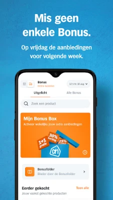 Уловете всяка изгодна сделка с персонализираните Бонус оферти, достъпни директно в приложението AH, включително предварителен преглед на бъдещи промоции. Активирайте своята „Моята Бонус Кутия" за седмични допълнителни предложения, подбрани специално за вас. Вашата Бонускарта винаги е на разположение, гарантирайки мигновени отстъпки и ексклузивни предимства. Създаването на списък за пазаруване никога не е било по-лесно: добавяйте продукти от предишни покупки, сканирайте баркодове, изберете от персонализираните оферти или директно от вдъхновяващите рецепти на Allerhande, след което поръчайте за доставка или вземане, като можете да променяте поръчката си до 12 часа преди изпълнението ѝ.