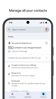 Поддържането на добре организирана и актуална мрежа от контакти никога не е било по-лесно. С Google Контакти можете прегледно да разделите хората по профили – независимо дали става дума за служебни партньори или лични връзки, осигурявайки ви ясен преглед на вашата комуникация. Добавянето на нови номера, имейл адреси, снимки или актуализирането на съществуващи данни става интуитивно и бързо. Приложението е ваш умен помощник и при обединяването на дублиращи се записи, предлагайки ви интелигентни предложения за добавяне на липсващи детайли, за да е сигурно, че всяка информация е на мястото си.