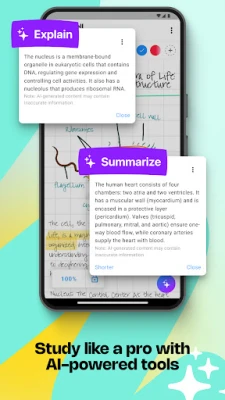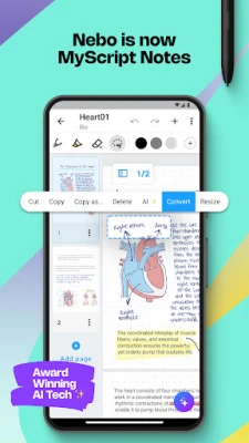 MyScript Notes трансформира дигиталното писане в безпроблемно изкуство. Пишете на ръка, въвеждайте текст или диктувайте в едно и също пространство – на една страница, в едно изречение или дори дума – поддържайки непрекъснат творчески поток. С невероятна прецизност, приложението преобразува ръкописните ви бележки и сложни математически изрази в дигитален текст, а нарисуваните диаграми – в идеални геометрични форми, които запазват своята възможност за редакция при експортиране. Интуитивните жестове с писалката ви позволяват да редактирате и форматирате съдържанието без усилие, докато маркерът служи за открояване, ласото за прецизен избор, а гумата – за изтриване на конкретни елементи или цели щрихи.