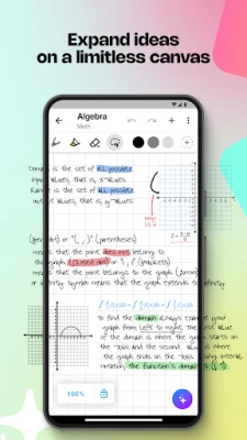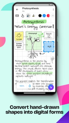 Открийте безкрайното платно на MyScript Notes, идеално за брейнсторминг сесии, изграждане на мисловни карти и спонтанни записки без ограничения. Лесно навигирайте, увеличавайте или намалявайте мащаба за свежи перспективи, докато ласото ви дава контрол да избирате, премествате, копирате, изтривате или преоразмерявате всеки елемент, включително да конвертирате ръкописен текст. При създаването на структурирани документи, MyScript Notes предлага уникално отзивчиво изживяване – вашият ръкописен текст автоматично се пренарежда и адаптира при всякакви промени в оформлението, завъртане на устройството или разделяне на екрана, винаги запазвайки безупречна четливост. Обогатете записките си с персонализирани типове писалки и фонове, добавяйте снимки, детайлни скици и интелигентни обекти като сложни математически уравнения и диаграми, които могат да бъдат решавани и копирани като LaTeX или изображение. MyScript Notes уважава вашата поверителност и никога не съхранява съдържание на своите сървъри без вашето изрично съгласие.