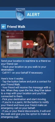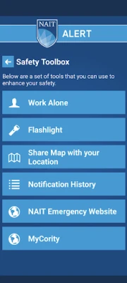 Бъдете винаги информирани чрез "Известия за безопасност", които ви доставят моментни съобщения и ясни инструкции от екипите за безопасност на кампуса при възникване на извънредни ситуации. Навигирайте с лекота в комплексите на NAIT благодарение на "Интерактивни Карти", които ви помагат да откриете пътя си и да се ориентирате бързо. В допълнение, NAIT Alert обединява всички важни "Ресурси за безопасност на кампуса" на едно удобно място, осигурявайки ви постоянна готовност и достъп до необходимата информация. С NAIT Alert вашата безопасност е винаги на едно докосване разстояние.