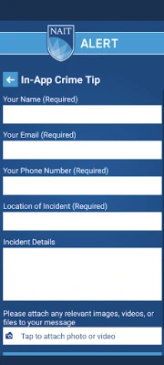 В критични моменти, функцията "Мобилна Синя Светлина" изпраща вашето точно местоположение на охраната на NAIT в реално време, осигурявайки незабавна реакция и подкрепа. Освен това, NAIT Alert предлага лесен достъп до "Спешни Контакти" за бърза връзка с правилните служби при спешни случаи или при несвързани с извънредни ситуации притеснения в района на NAIT. Чрез опцията за "Подаване на Сигнали" можете дискретно да информирате охраната за всякакви притеснения, свързани с безопасността, по множество удобни начини, допринасяйки за по-сигурна общност.