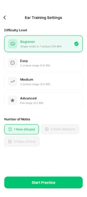 Read Notes Game предлага два основни режима за цялостно развитие на вашите умения. Режимът за **скоростно нотно четене** ви помага да разпознавате нотите на петолинието и да ги свързвате с правилния клавиш на пиано клавиатурата. Упражнявайте се с виолинов ключ, басов ключ или голямо петолиние, за да изградите светкавично разпознаване, жизненоважно за всеки музикант. Междувременно, режимът за **тренировка на слуха** изостря способността ви да слушате и идентифицирате ноти, интервали и акорди само по звук. Тренирайте с мажорни, минорни и септакорди, за да развиете относителния си слух и да укрепите основите на музикалната си теория.